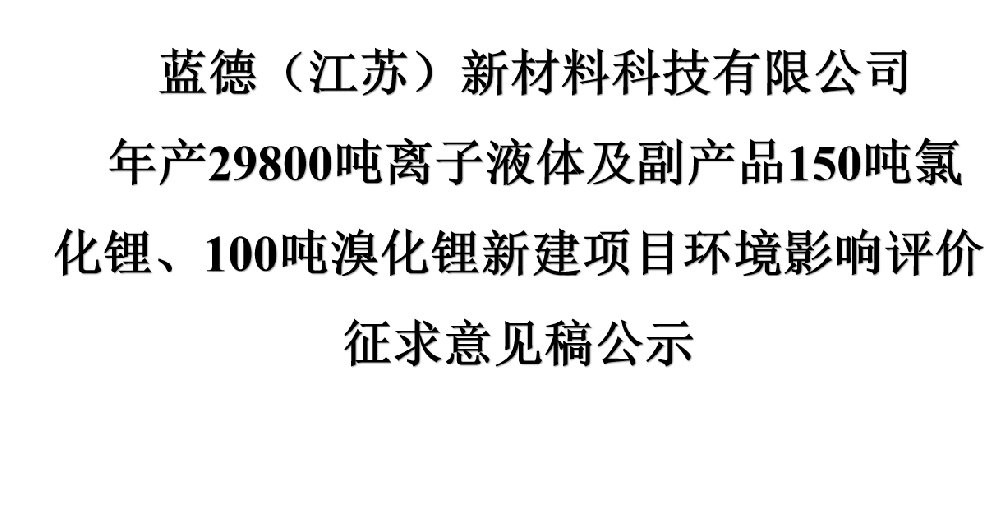 藍(lán)德(江蘇)新材料科技有限公司 年產(chǎn)29800噸離子液體及副產(chǎn)品150噸氯化鋰、100噸溴化鋰新建項目環(huán)境影響評價征求意見稿公示